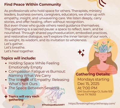 Join The Gathering Ground for Professionals, a free weekly group designed to support your professional and personal life in a tranquil setting. This is more than just a networking hour—it's an opportunity to practice self-care and learn valuable coping skills in a calm, peaceful environment.
